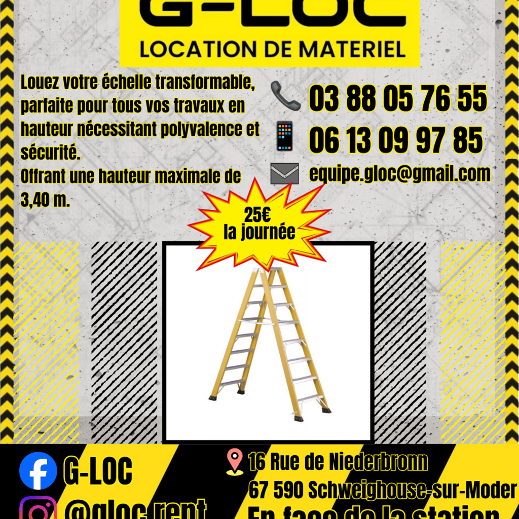 Louez votre échelle transformable G-LOC, idéale pour tous vos travaux en hauteur nécessitant sécurité et polyvalence.