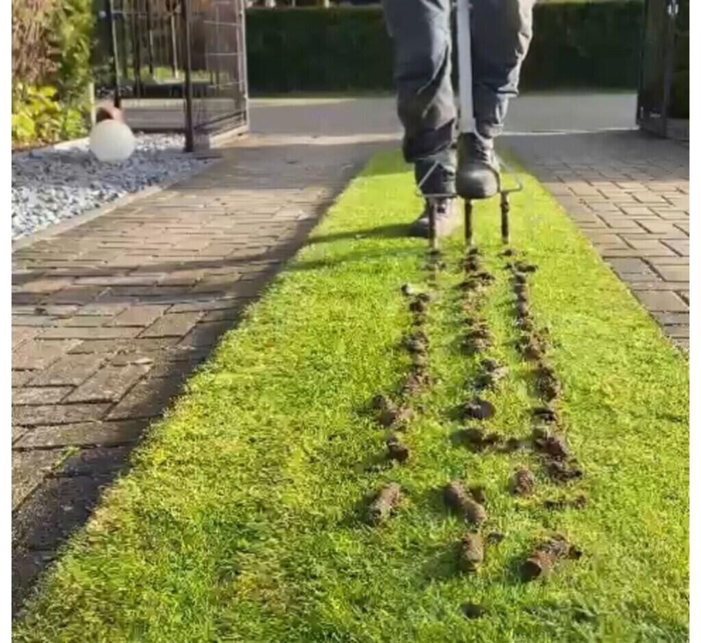 Si le sol est très compacté (phénomène naturel), tu dois l'aérer: l'aérateur manuel RISISANI permet de percer des trous dans le sol. Tu peux ensuite facilement enlever les morceaux de terre (carottes) de la pelouse à l'aide d'une pelle à neige / rateau et les composter.