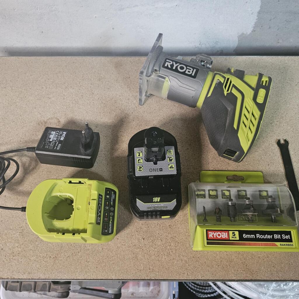 Affleureuse à bois 18V ONE+ avec une batterie et un chargeur. Et une boîte d'outils à fraiser.