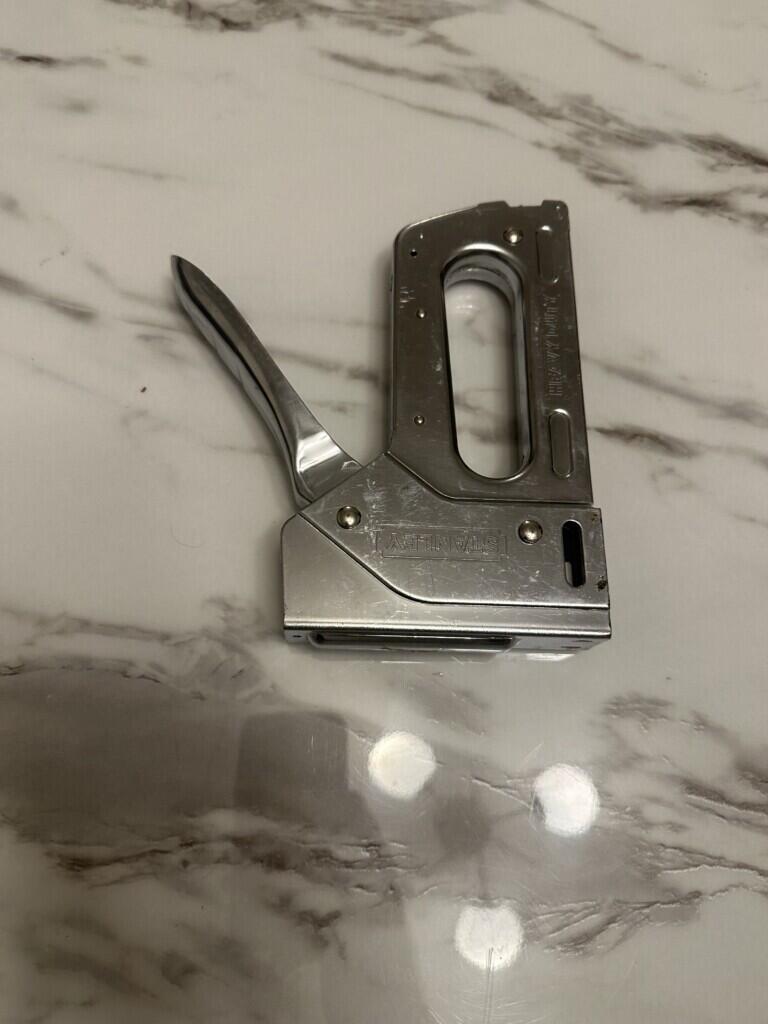 Une agrafeuse manuelle en métal, souvent utilisée pour des travaux de bricolage ou de tapisserie.