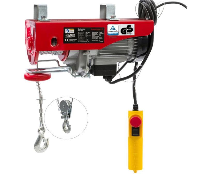 Arebos Treuil Palan électrique | 400/800 kg | 1300W | palan à câble équipé d’un puissant moteur à engrenages en cuivre de 1300 W permet de soulever facilement des charges lourdes de 500 kg (sans poulie) à 1000 kg (avec poulie).