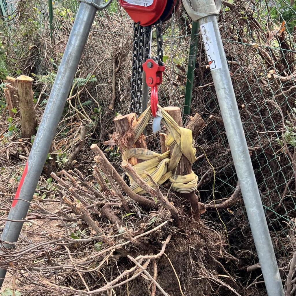 L’ensemble est constitué d’un trépied, d’un palan et de 3 élingues (une de 3 mètres et deux de 1 mètre) pour dessoucher des arbres de petite et de moyenne taille.