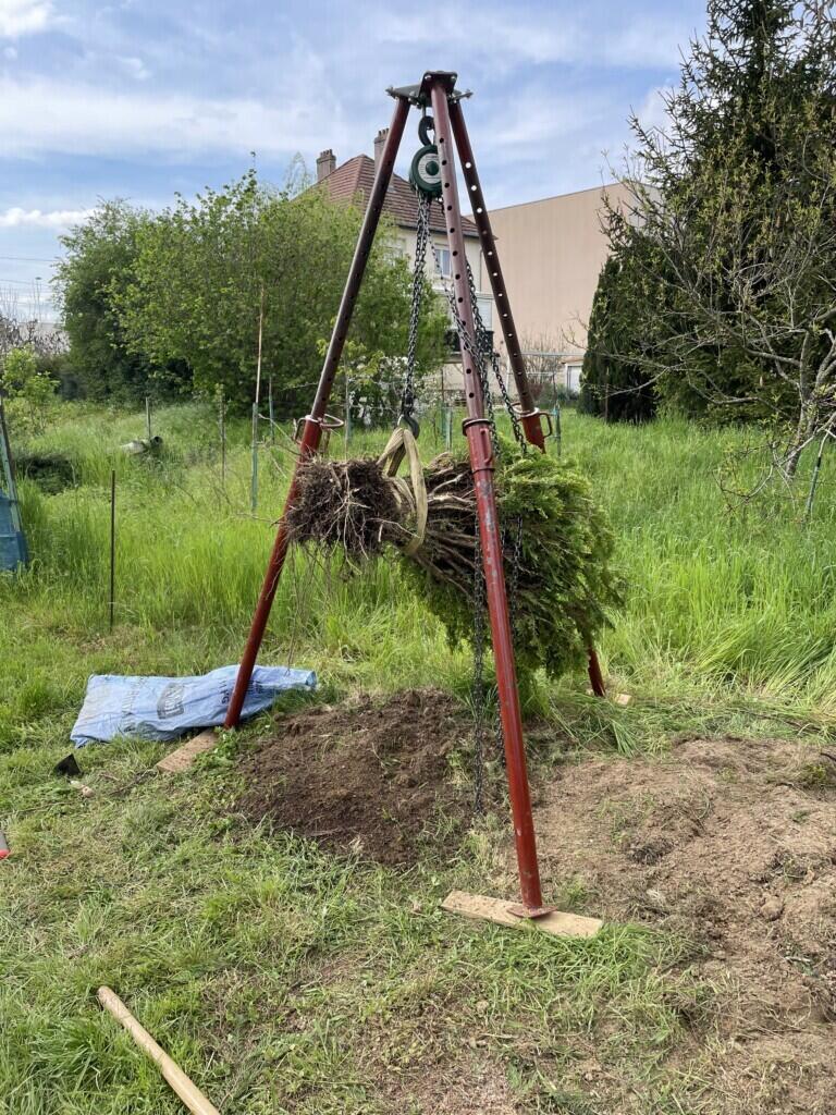 Compose de 3 étais standard, une pièce de liaison avec sa visserie, palan 2T, élingue. Il permet d’enlever sans efforts les haies de thuyas, cyprès, buis ….