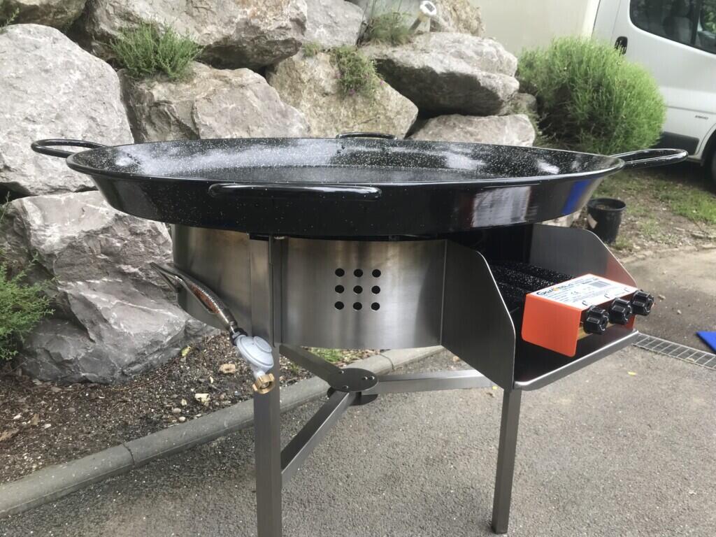 loue Kit poêle a paella 80 cm 40 a 50 personnes . couvercle , trépied et pare vent en inox . Idéal pour les cuissons en intérieur comme en extérieur . Brûleurs 3 feux réglables .