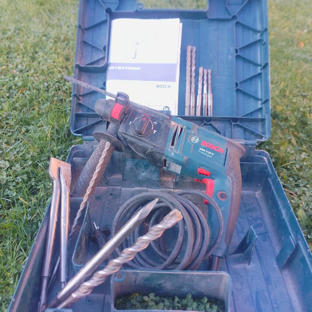 Perforateur filaire Bosh pro en très bon état.Avec des forets béton de 6;8 court;8 long;et 8 très long;10;18mm,2 burins de 2 et 4cm et un pic.Poignée a l avant et tige graduée pour régler la profondeur.