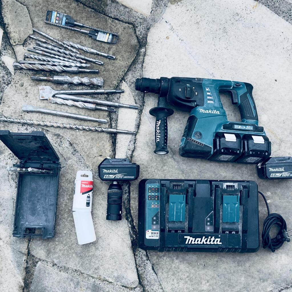 Outil puissant, entretenu et fourni avec un kit complet de forêts et burins + batteries + chargeur double rapide Makita.