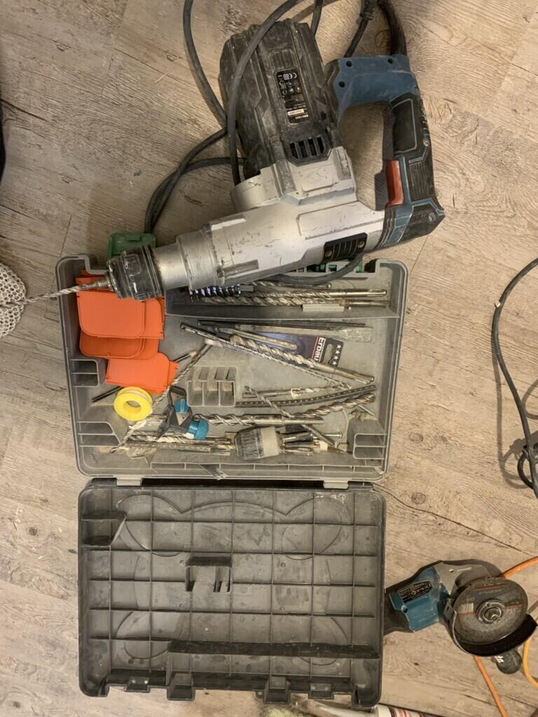 Perforateur burineur fournit avec malette de forêt béton et outils de burinage.