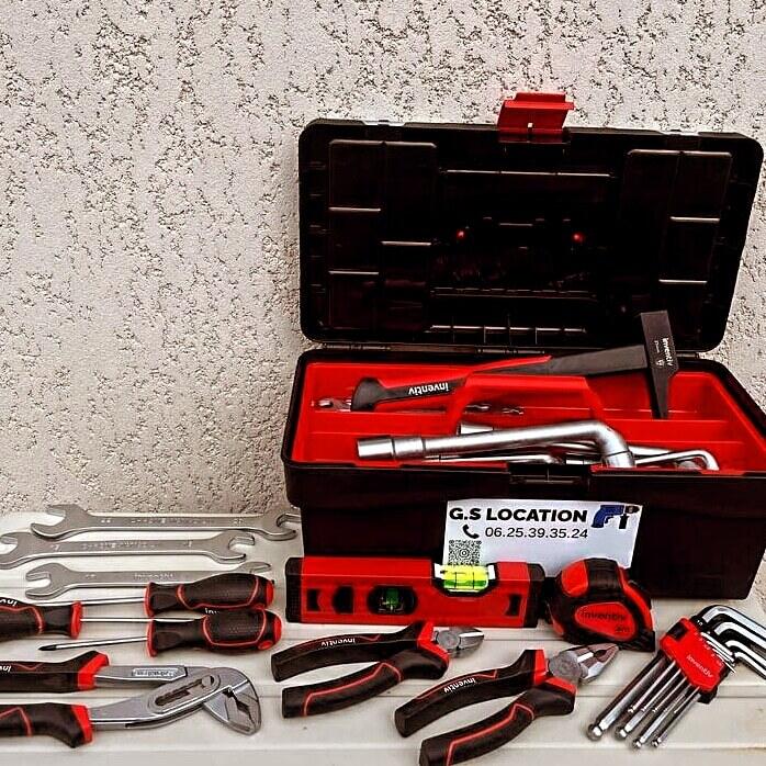 Boite a outils avec clef à pipe , clefs plate , tournevis , marteaux , niveaux , pince , clef à laine , mètre