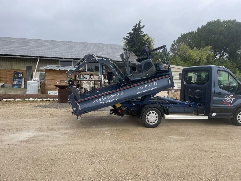 loue camion benne état neuf avec la spécificité d’un bras en parole qui permet de mettre la benne au sol