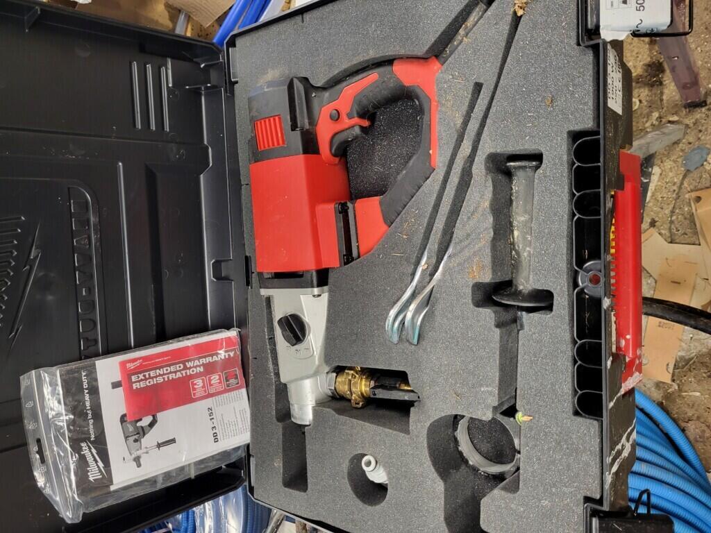 Carotteuse à eau Milwaukee 1900W avec deux carottes de 82mm et 127mm disponible.