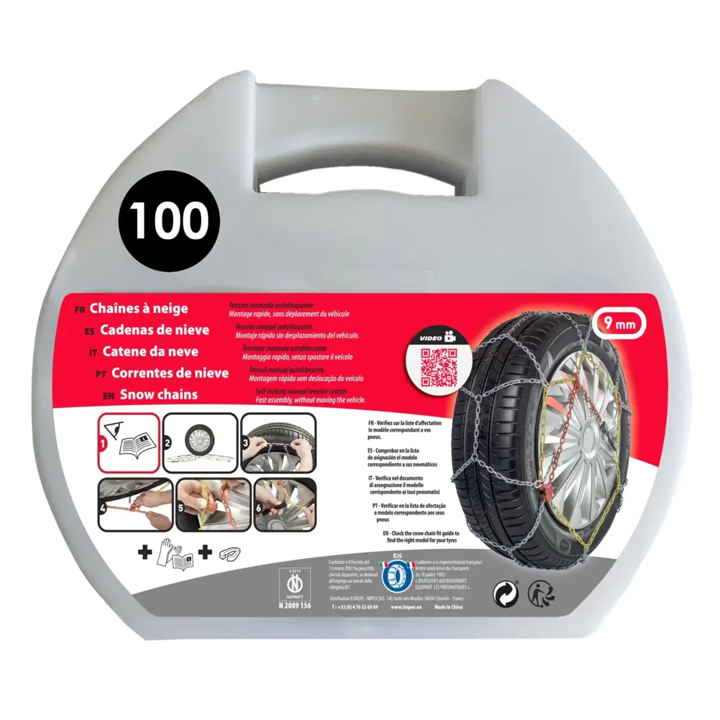 Chaînes à neige neuves, référence , d'un diamètre de 9mm. Nom de marque : Impex - Type de produit : Chaînes à neige - Quantité : Paire - Référence : - Diamètre : 9mm