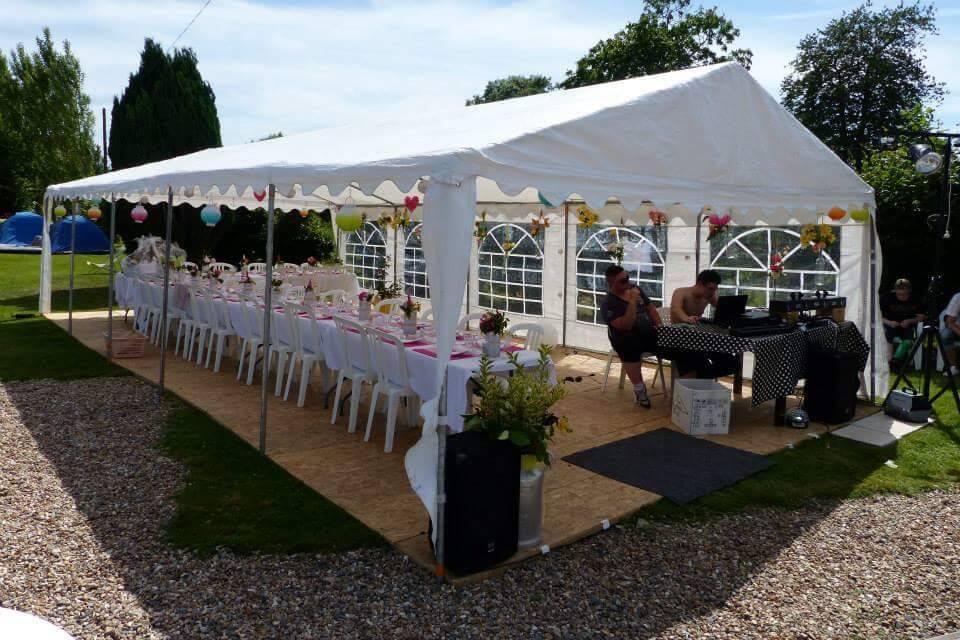 À louer, Tente de réception 5x8m Acier PRO, compris habillage bâches cloisons 4 cotés avec fenêtres. 200€/Week – capacité 80 debout / 48 à 57 assises