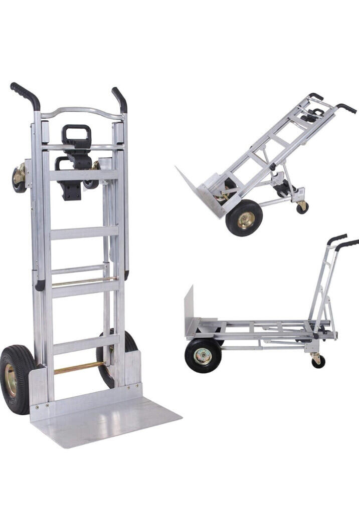 Diable léger en aluminium avec 3 fonctions pour transporter facilement des charges lourdes ou encombrantes. Utilisation polyvalente, soit comme diable avec ou sans support ou comme chariot de transport. Grâce à un mécanisme de pliage, le chariot peut être transformé en un tour de main.