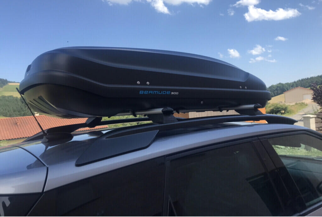 Coffre de toit Bermudes 300. Fixation sans outils sur vos barres de toit.