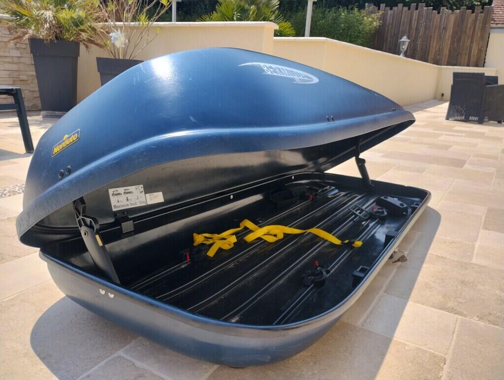 Propose à la location coffre de toit grande capacité, ouverture latérale, fermeture à clef, système de fixation x4 en forme de U