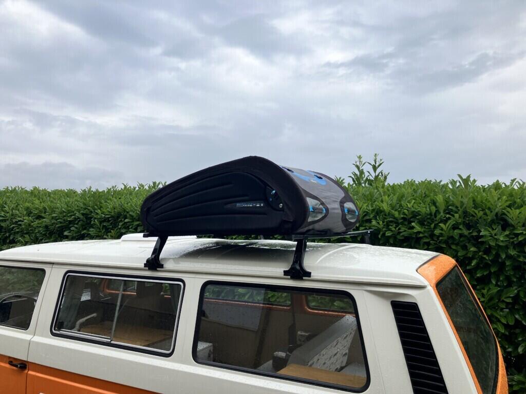 Coffre pliable, permettant une fois vide en vacances de ne pas l’enlever du toit, et de ne pas prendre de la place.