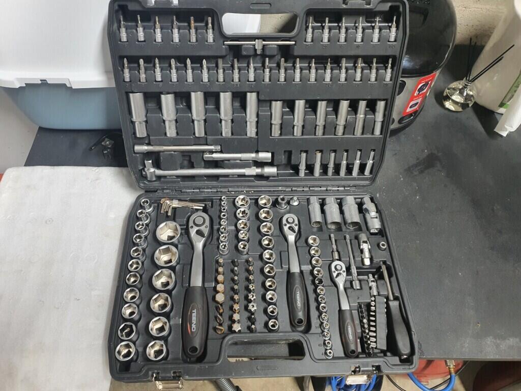 Coffret à douille et différent embout avec petit, moyen et grand cliquet manque une douille de 10 longue mais y en a d'autre dedans