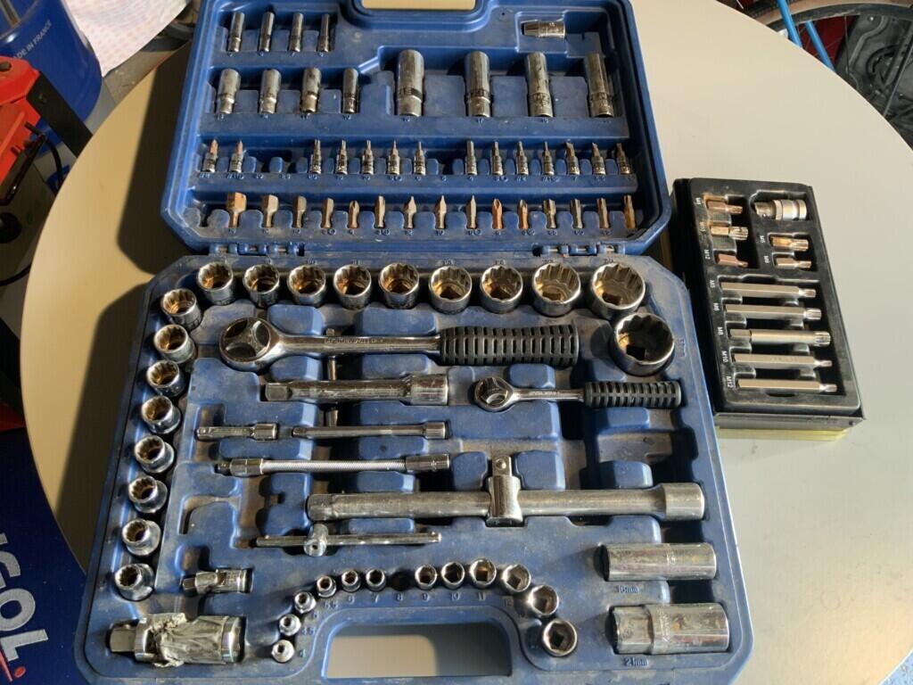 Coffret, avec deux clés à cliquer, douilles, embouts cruciforme, plat, torx, rallonge, etc…. Idéal mécanique auto.