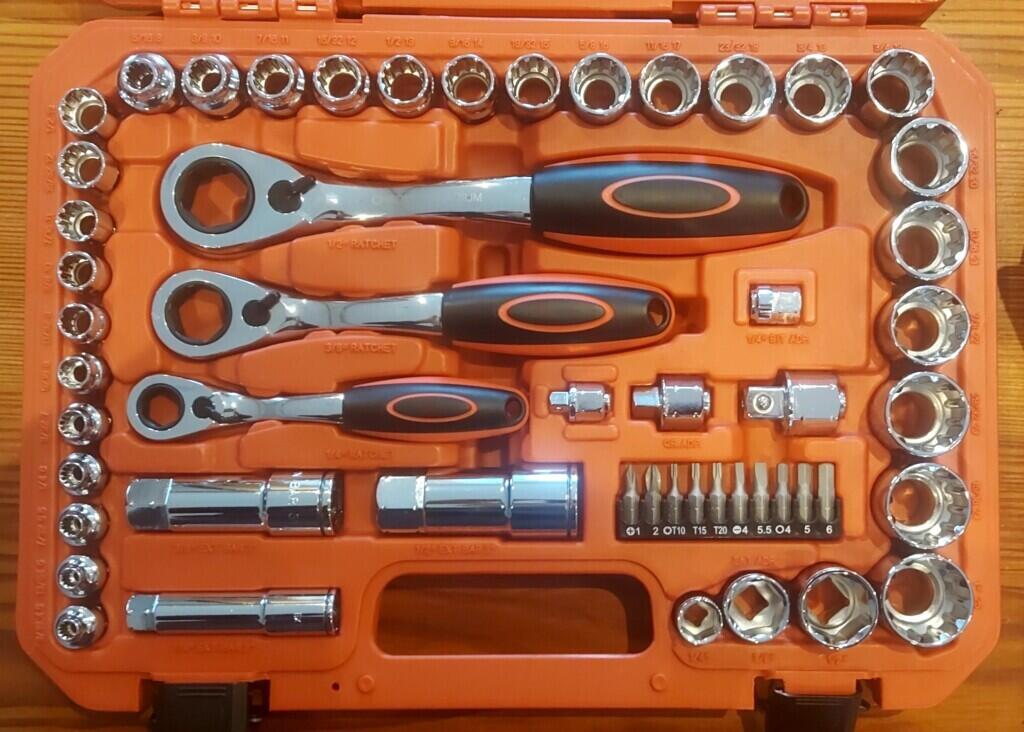Malette de 3 clés à cliquet 1/4, 3/8 et 1/2. Avec douilles débouchantes pour écrou 6 ou 12 pans, adaptateur porte embout, adapateur douille standard pour les 3 clés et " rallonge de 75mm de long,