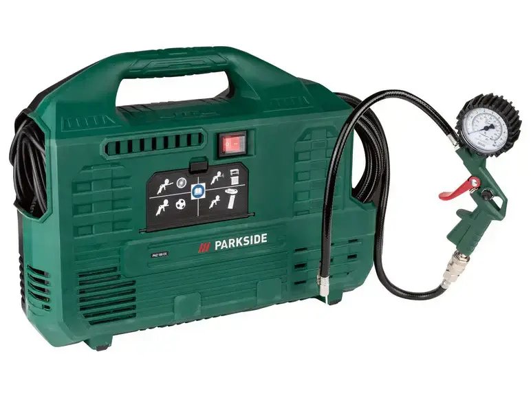 Loue compresseur portable avec 1 soufflette avec manomètre, 1 flexible avec fermeture rapide à levier, set d’adaptateurs et de buses (9 pièces) pour toutes les utilisations