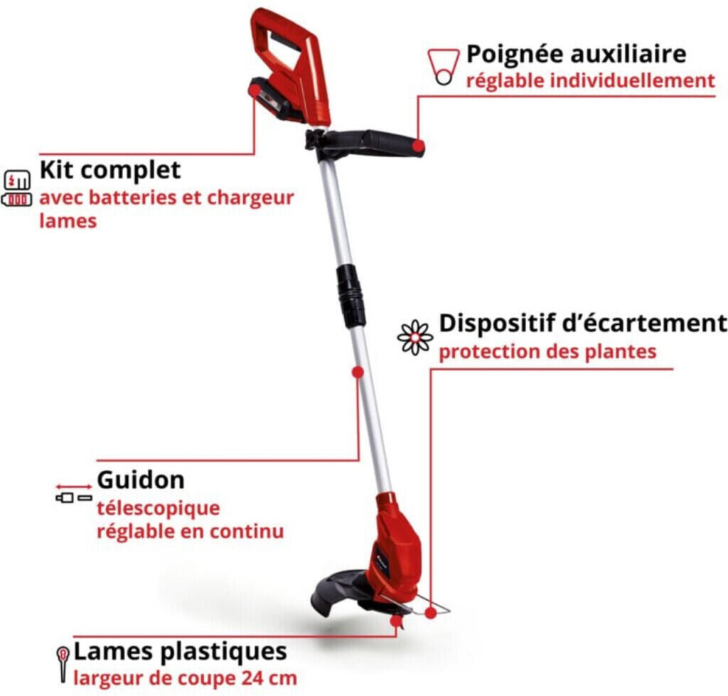 Coupe bordures électrique sans fil Einhell GC-CT 18/24 Li P puissant, idéal pour l’entretien de votre jardin sans aucune restriction de mouvement, lames plastiques jusqu’à 8500 tours/mn.