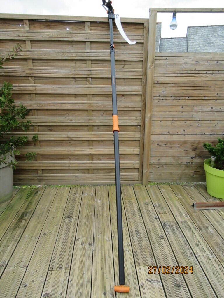 coupe branche télescopique , diamètre de coupe de 32 mm , une lame de scie en carbone d 'une longueur de 40 cm , manche télescopique de 2.46 m à 4 m