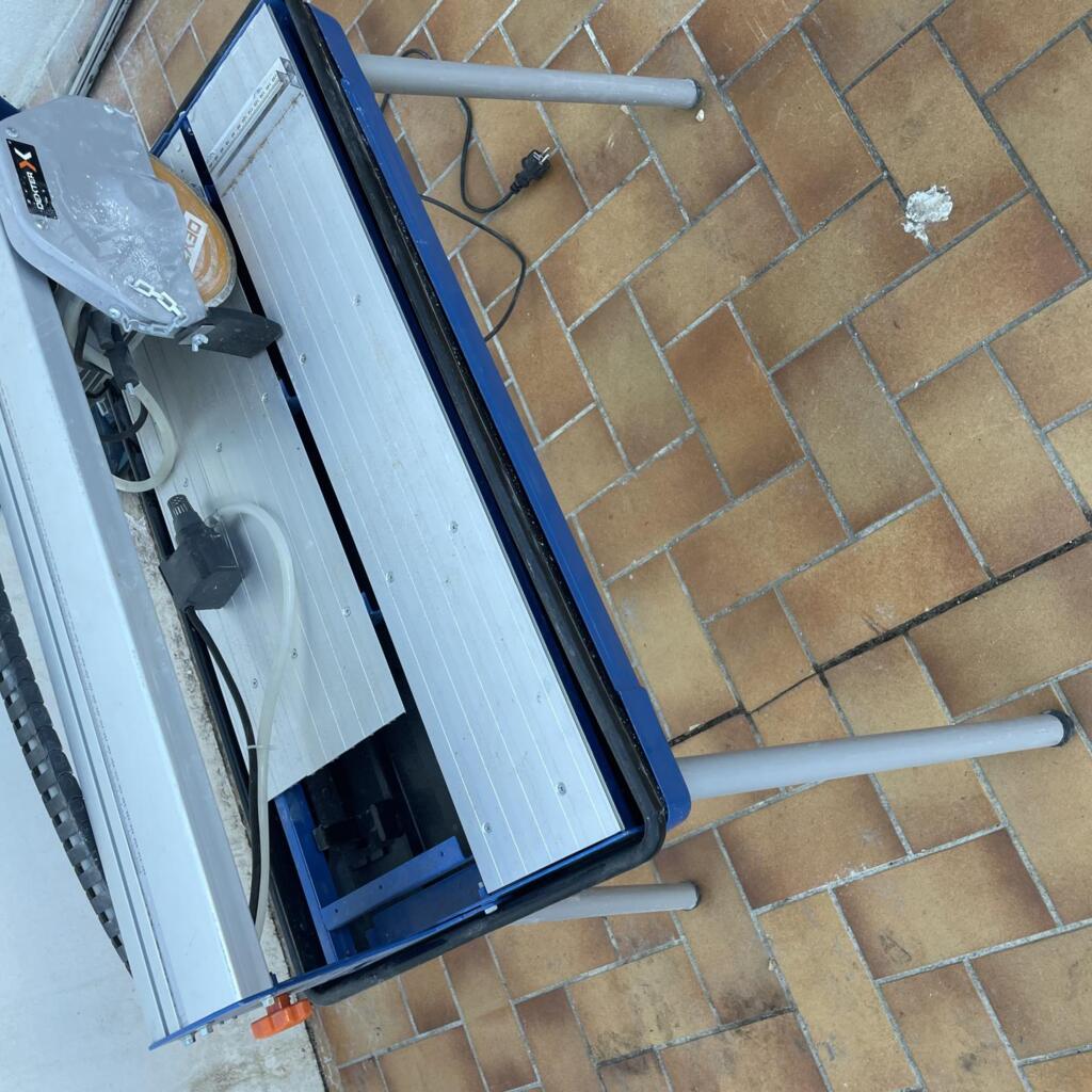 Coupe carreaux ou pavé à eau électrique, fonctionne sur prise V classique, la pompe arrose la lame pour ne faire quasi aucune poussière.