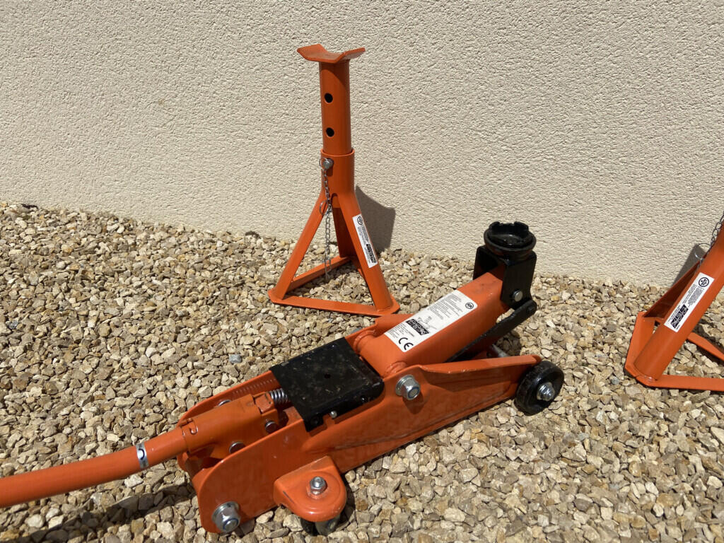 Loue un cric hydraulique rouleur 1,5 tonne accompagné de deux chandelles de sécurité, idéal pour tous travaux de mécanique auto : changement de roues, freinage, vidange, etc.
