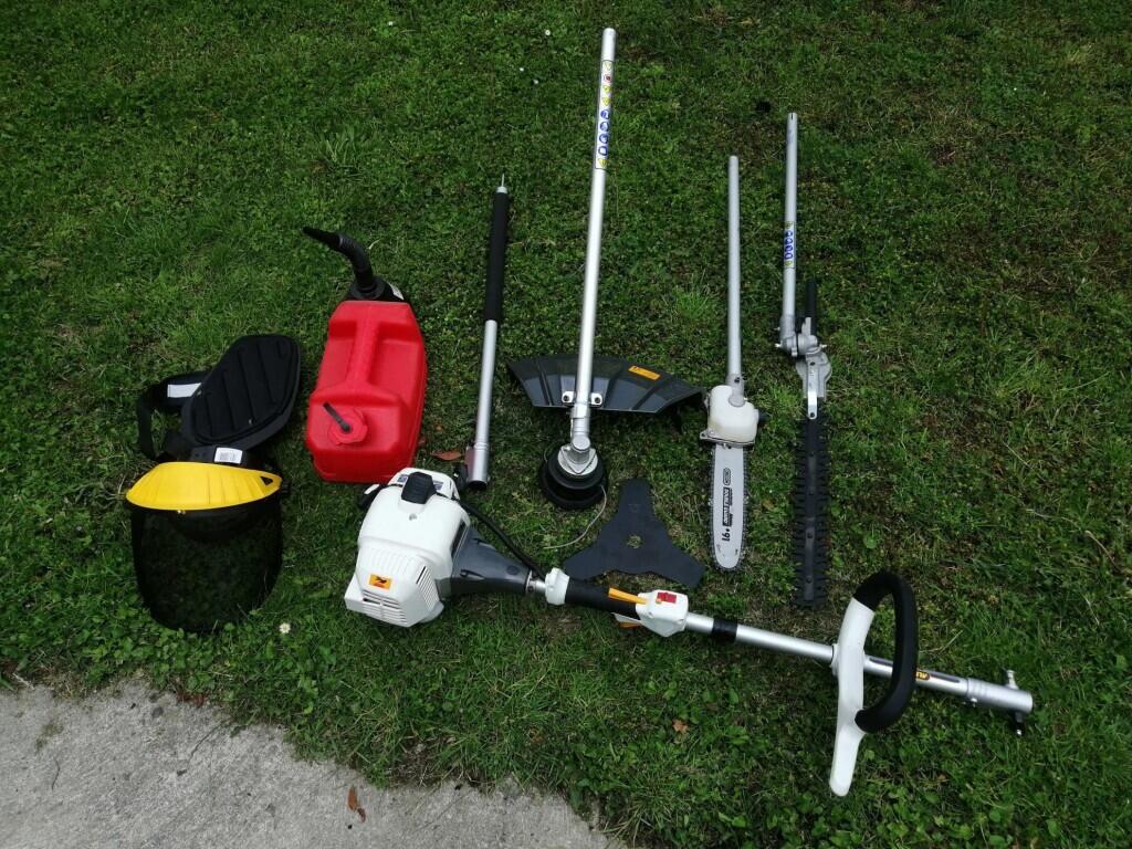 Débroussailleuse (nylon/ lame) +élagueur + taille-haies. Jusqu'à 3mt de hauteur, moteur 2 temps . Longueur de taille de l'élagueur 25 cm, taille-haies 40 cm.
