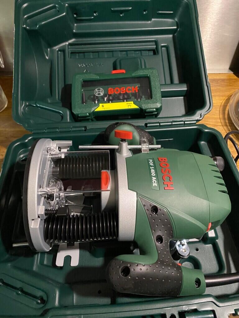 Accessoires inclus: 1 coffret de transport, 6 fraises (2 fraises droites / 1 fraise à arrondir avec roulement à billes / 1 fraise à canneler / 1 fraise à queue d'aronde) 1 butée parallèle, 1 bague de copiage SDS, 1 adaptateur d'aspiration, 1 point de centrage, 2 pinces de serrage (6 mm – 8 mm )