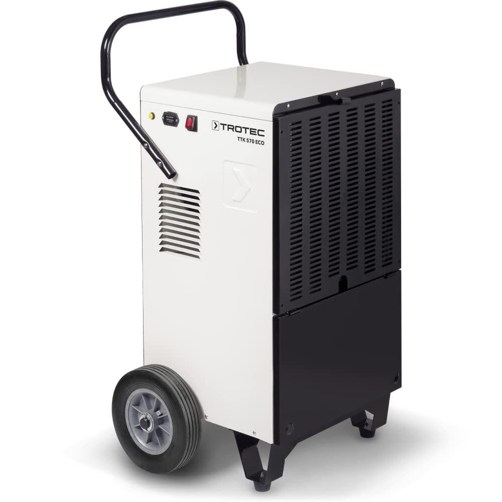 Un accès central à tous les éléments importants : raccordement pour l'hygrostat, compteur d'heures de service et interrupteur. Deux supports intégrés et une fixation pour la prise assurent un rangement parfait et évitent de trébucher. Le filtre à air intégré est facilement accessible et ainsi facile à nettoyer ou à remplacer. La construction en forme de robuste trolley facilite le transport d'un chantier à l'autre. Les grandes roues et les pieds avant caoutchoutés offrent beaucoup de mobilité et une grande stabilité. Une pompe externe peut être raccordée à l'évacuation de l'eau de condensation si l'écoulement doit s'effectuer à un niveau plus élevé.