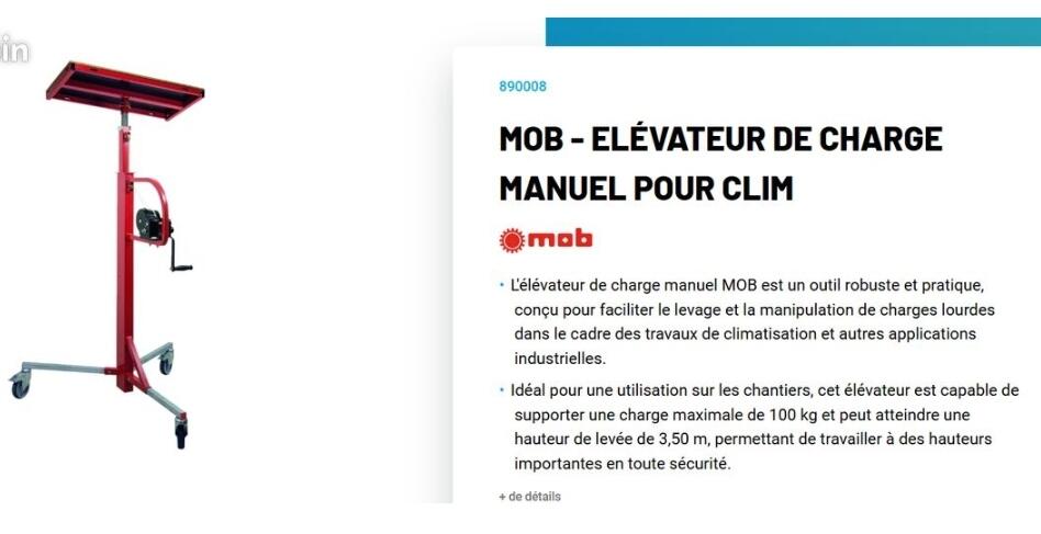 Le lève-charge manuel MOB à une capacité de charge maximale de kg avec une hauteur de pose de m.