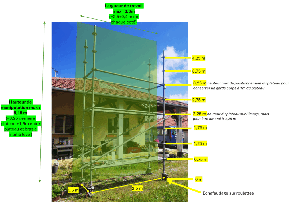 Je vous ai annoté une photo pour que vous puissiez apprécier l’espace accessible en se plaçant sur l’échafaudage.