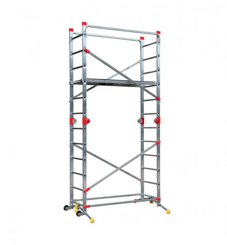 Echafaudage multifonction en aluminium Hailo CombiLot 5 – Hauteur de travail jusqu'à 4m30 – Utilisable en 4 positions différentes – 2 bases avec compensation de dénivelé – Montage rapide Fast&Lock – Hauteur max de la plateforme : 2m33 – Dimensions de la plateforme : 155×50 cm Rattrapage de niveau – Plateforme hydrofuge antidérapante – Charge max 150 kg – Conforme aux normes EN 131 et NF E85-200 – Poids : 35 kg