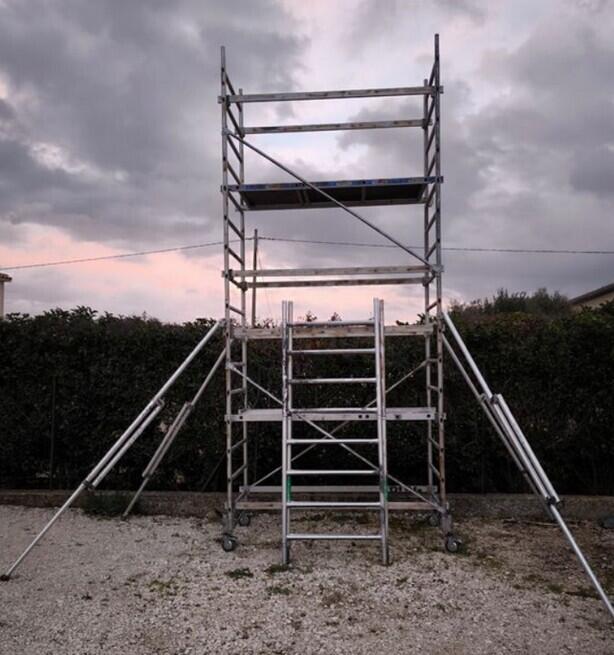 Échafaudage roulant professionnel de la marque Tubesca. Modèle Totem montant jusqu’à une hauteur de travail de 9m (plancher à 7m). Très léger car tout en aluminium.