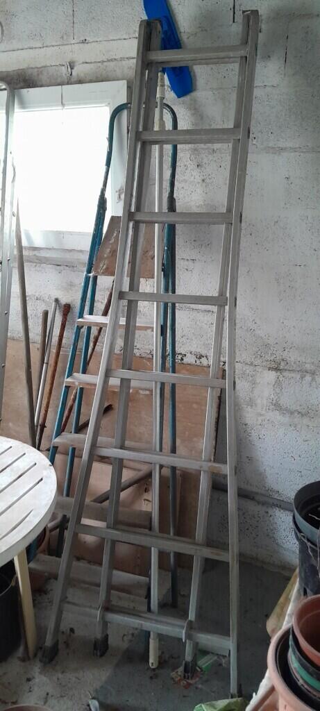 Échelle coulissante aluminium 2 sections. Hauteur d’une section environ 2.40 mètres. Transformable en escabeau. Retrait landerneau