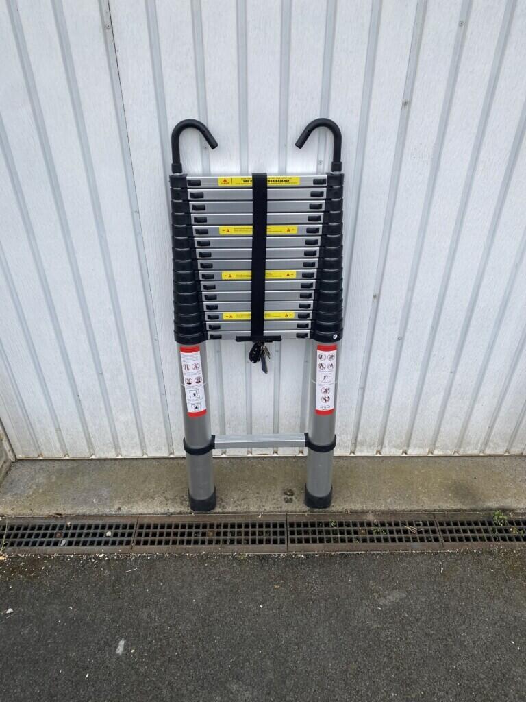 Échelle télescopique alu de 6m20 entièrement dépliée.