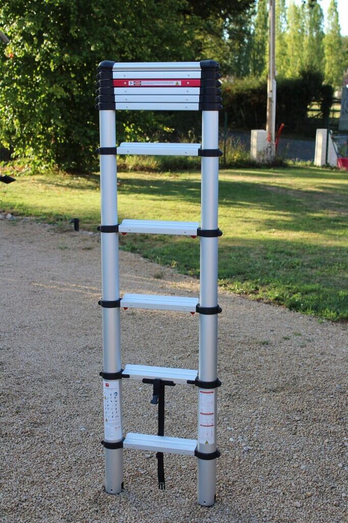 Qualité professionnelle Marches extra-larges pour plus de confort Super compact pour un transport et un stockage aisés Système de coulissage par air : évite le pincement des doigts Aluminium anodisé : ne salit pas les mains Barre stabilisatrice conforme à la norme EN131-6