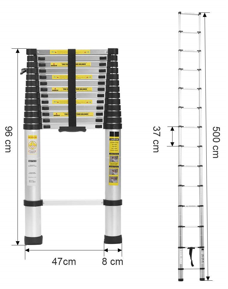 Dimensions: repliée (L x l x h) 47 x 8 x 96 cm. Déplié max 5m