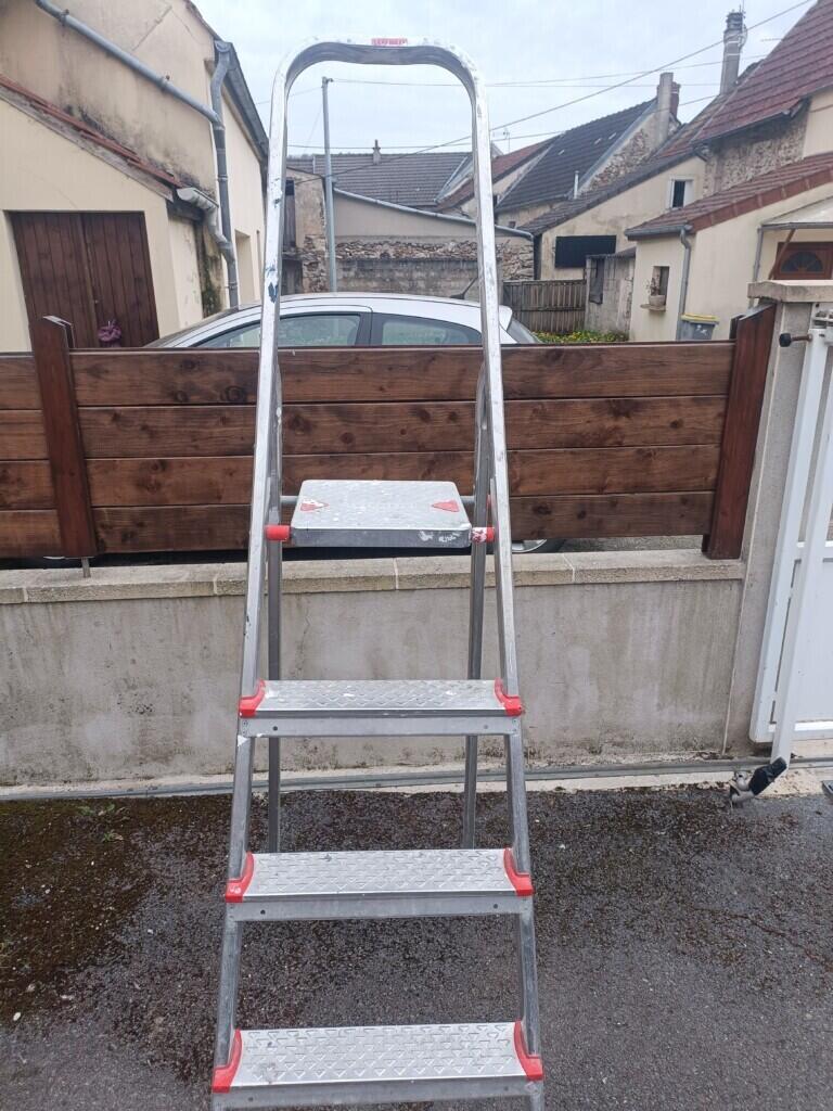 Escabeau 4 marches. Utilisé (traces de peintures récurrentes) mais toujours fonctionnel.