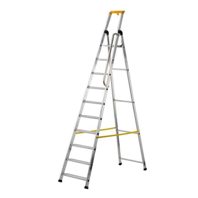 Escabeau professionnel 10 marches disposant de marches larges (11 cm) à striures antidérapantes avec retour de matière anti-coupures, d’une solide structure en aluminium avec renforts postérieurs et des articulations en acier pour une plus grande stabilité. Il dispose également d’une tablette porte-outils et de patins antidérapants fixés aux montants pour vous offrir une meilleure stabilité et plus d’adhérence au sol. Tablette intégrée. Hauteur de travail : 4 mètres.