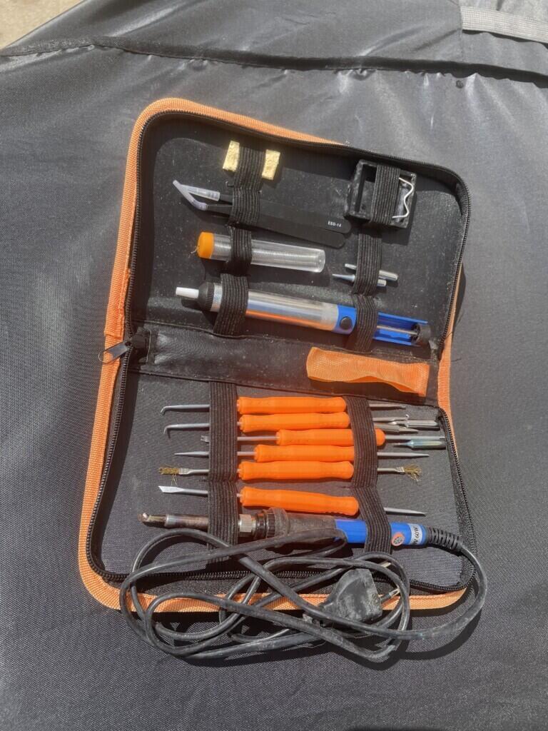 Fer à souder avec accessoires, brosses, étain, pompe à vide et différents embouts