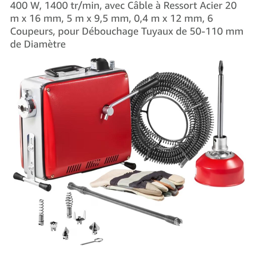 Je loue un furet déboucheur de canalisations électrique VEVOR, idéal pour déboucher efficacement les tuyaux de 32 à mm : évacuations cuisine, salle de bain, WC, regards extérieurs, etc.