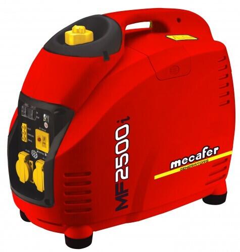 Groupe électrogène MECAFER MF2500i. Livré avec le plein ; à rendre avec le plein. Carburation: essence sans plomb 95 ou 98. Equipé de 2 prises 230V. Puissance max: 2500W. Puissance nominale: 2200W. 4,7HP. Autonomie: 4,25heures. Technologie Inverter permettant la production d'un courant "propre" proche du courant domestique, idéal pour tous les appareils électroniques sensibles. Compact et portatif avec poignée. Faible niveau de bruit. Protection contre les surcharges et système d'alerte niveau d'huile faible. Câbles pour recharge batterie 12V. La génératrice multi-pôles produit un courant à fréquence et tension stables (Taux Distorsion Harmonique 3% variation de tension 1.5%). Fonction de ralenti adaptant la vitesse de fonctionnement à la charge demandée pour réaliser des économies de carburant et limiter les émissions sonores. Poids: 29kg.