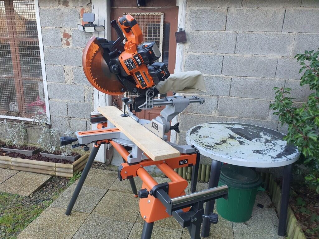 Je vous propose en location une scie radiale AEG sur 2 batterie et sur pied AEG.