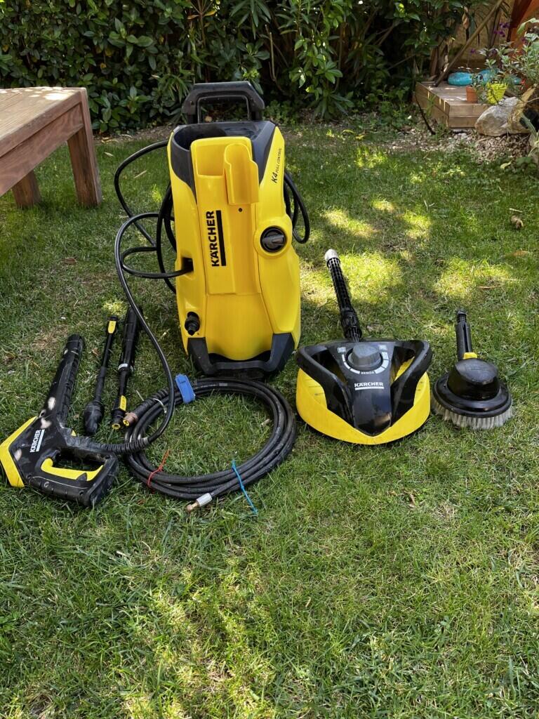 Nettoyant haute pression Karcher K4 full control avec brosse rotative pour surfaces (terrasses…), brosse voiture, tuyau déboucheur de canalisation.