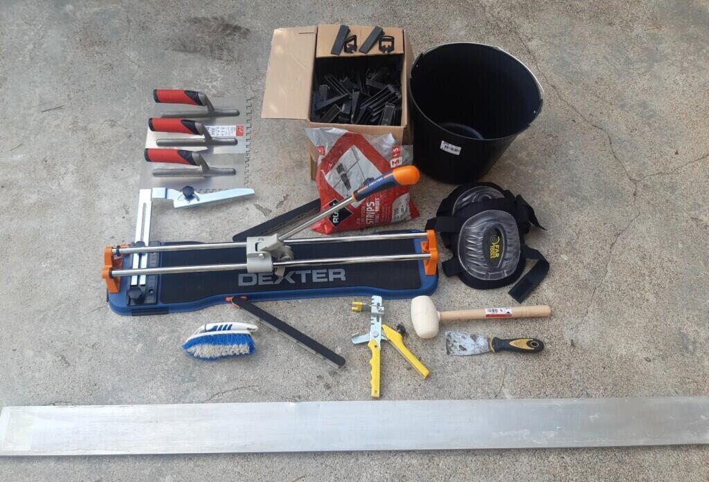 Carrelage/Faïence : Carrelette 60cm, peignes à colle de 6 à 12mm, genouillères gel, pince pour câles autonivelantes, cales autonivelantes, (possibilité de fournir les croisillons autonivelant) , petite spatule, truelle, maillet, règle 1.50m, et une brosse pour le nettoyage (sans surcoût) .