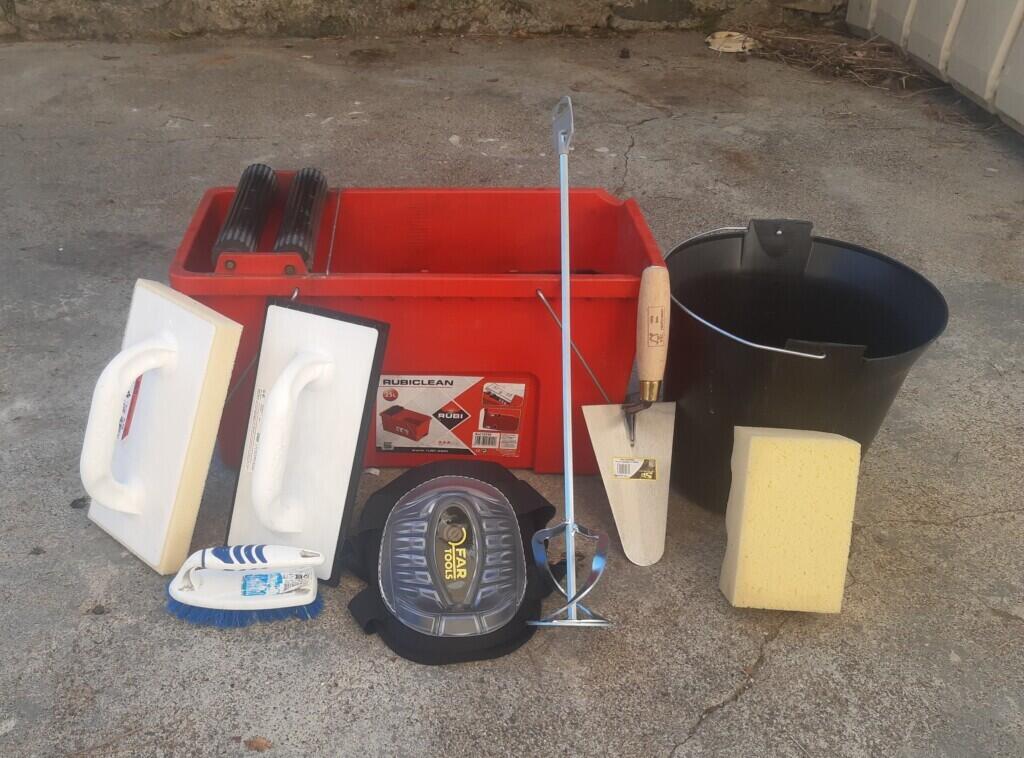 kit complet pour joint carrelage/faïence : Bac essoreur, talochon caoutchouc, talochon mousse, grosse éponge, sceau, petit malaxeur (à fixer sur une perceuse), genouillères gel, truelle, et une brosse pour le nettoyage (sans surcoût)