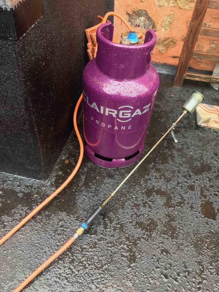 Chalumeau avec lance 60 mm. Buse Ø 60 mm. Prêt à l'emploi avec tuyau 5m et détendeur haute pression 2,5 bar. Destiné à chauffer et coller les surfaces bitumineuses dans le bâtiment et façonner le métal.