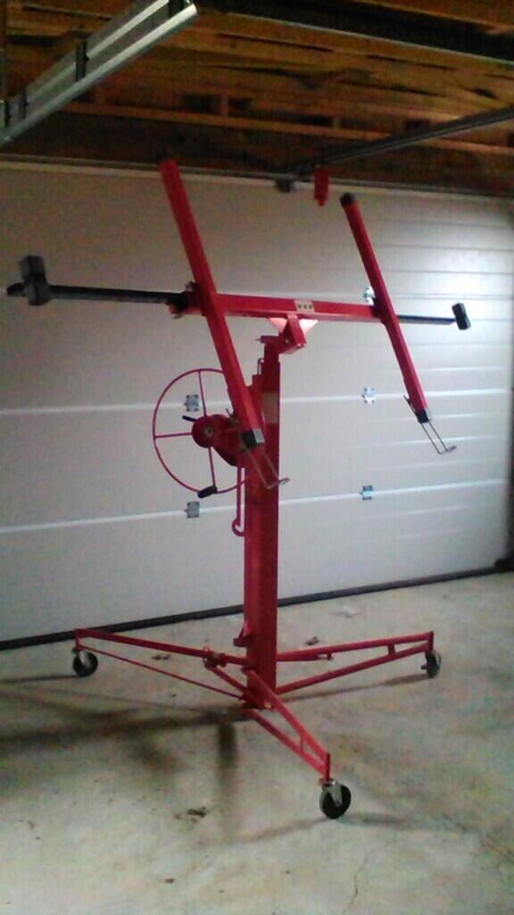 Location lève plaque Exploitation simple et rapide avec un treuil à 1 vitesse et un frein. Convient également pour les plafonds et les murs en pente avec une plate-forme élévatrice incliné Réglage en hauteur de 120 cm à 335 cm. Permet de soulever de panneaux de 1.22m X 4.88m. Trois grandes roues orientables avec freins de blocage.